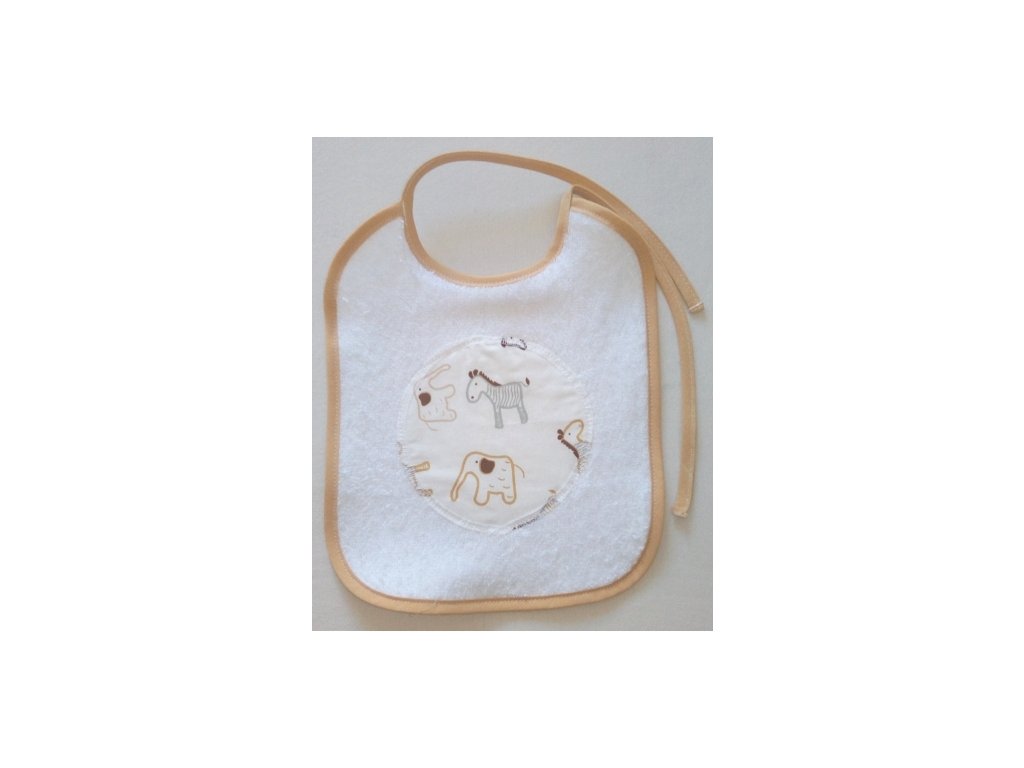 Froté bryndák na zavazování pro miminka a malé děti do 3 let, vyrobený v ČR. Měkký, savý a bezpečný, chrání oblečení při krmení. Lemování v béžové barvě.