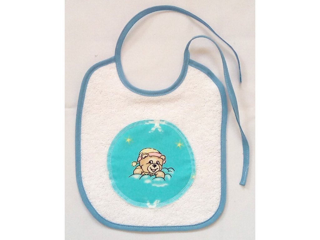 Froté bryndák na zavazování pro miminka a malé děti do 3 let, vyrobený v ČR. Měkký, savý a bezpečný, chrání oblečení při krmení. Lemování v modré barvě.
