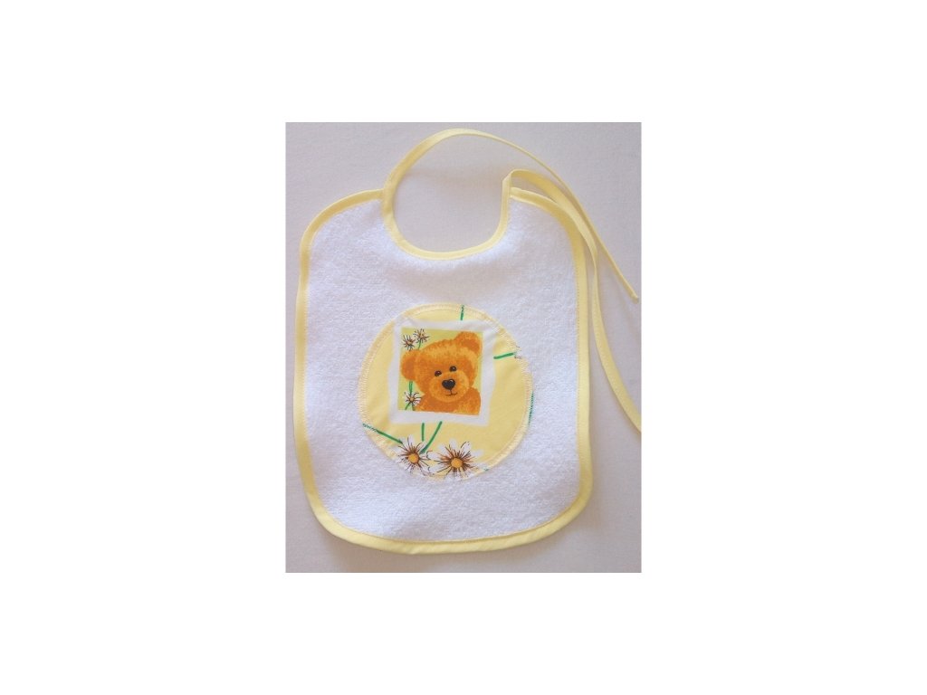 Froté bryndák na zavazování pro miminka a malé děti do 3 let, vyrobený v ČR. Měkký, savý a bezpečný, chrání oblečení při krmení. Lemování ve žluté barvě.