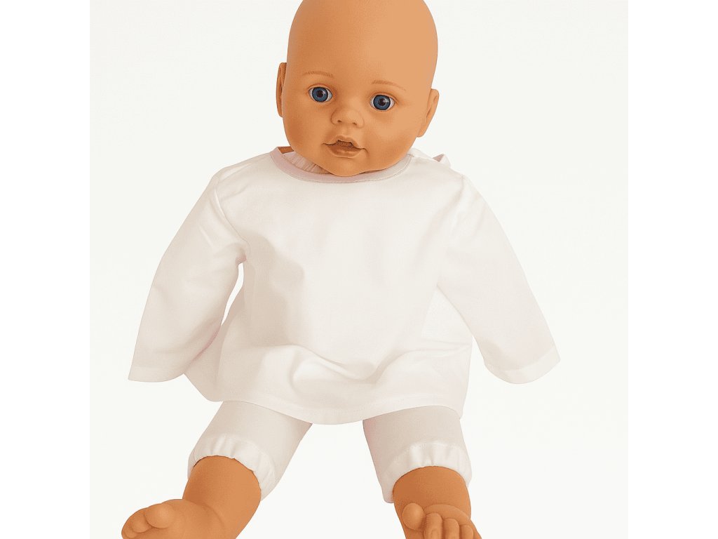 Miminko položíš, košilku přes něj jemně přehodíš, vsuneš ručičky do rukávků a zavážeš šňůrku. Košilka dobře drží a nikde netlačí.