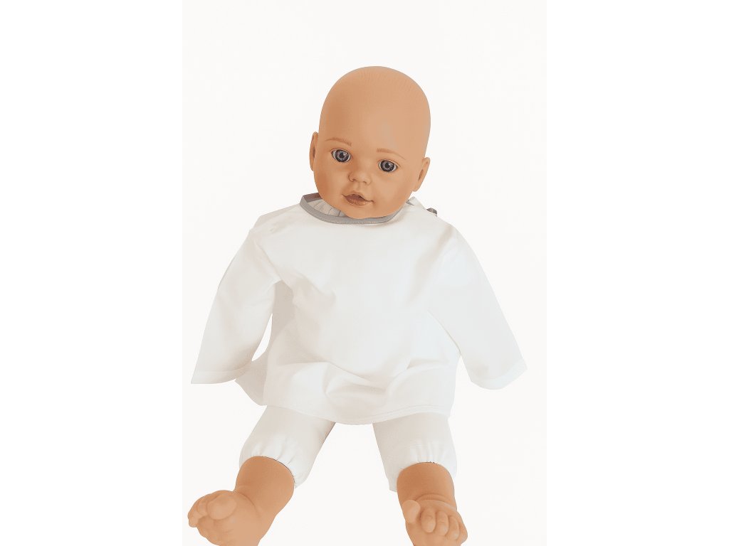 Miminko položíš, košilku přes něj jemně přehodíš, vsuneš ručičky do rukávků a zavážeš šňůrku. Košilka dobře drží a nikde netlačí.