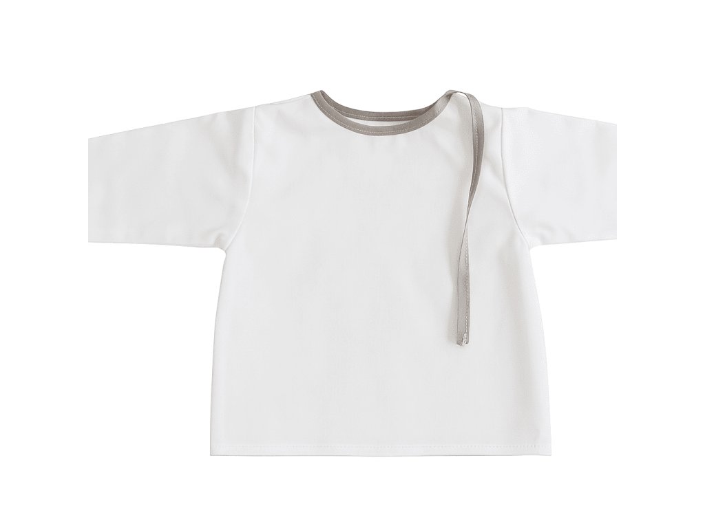 Šedé lemování u krku dodává košilce čistý, neutrální vzhled, který se hodí pro holčičky i chlapečky.